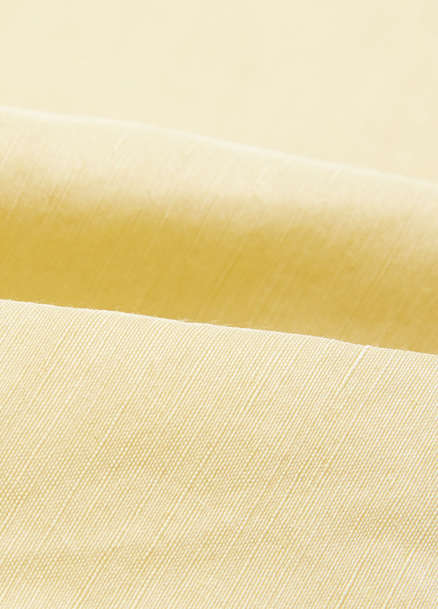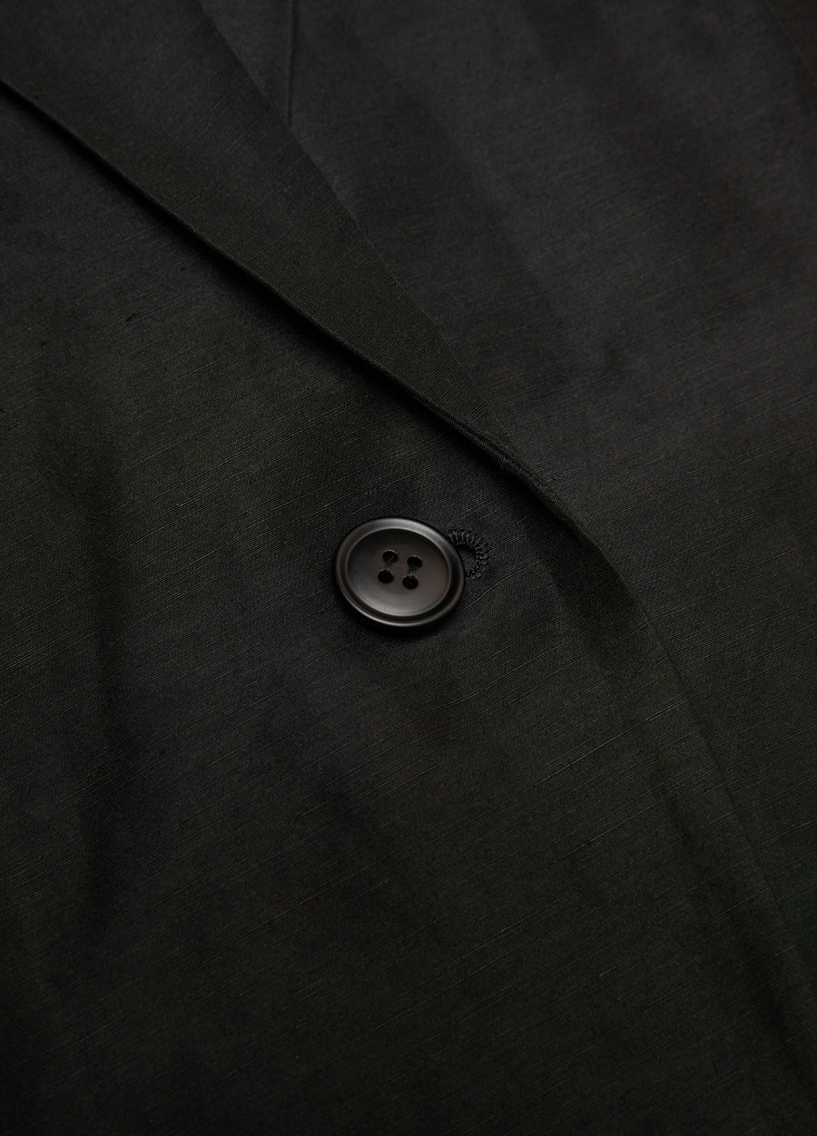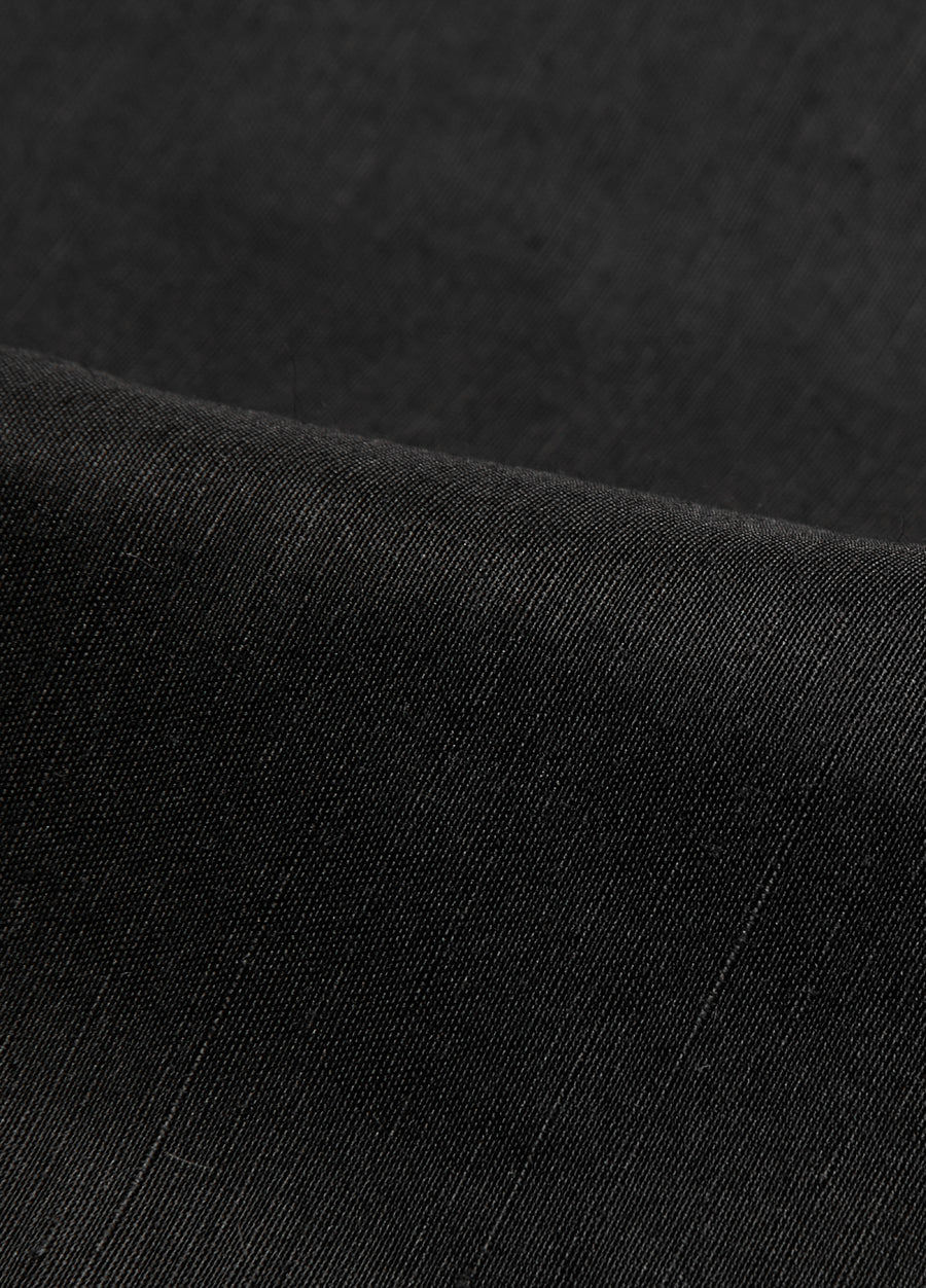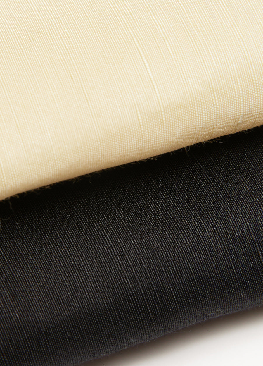 The fabric is woven with linen as the base and added with mulberry silk. The luster of silk adds a sense of quality to the natural linen fabric. The surface of the fabric is smooth and delicate. The interspersed linen yarn adds a three-dimensional texture to the surface without losing the linen The original skinny; the wrinkled texture of the surface and the cut details of the suit have a sense of collision between retro and modern.