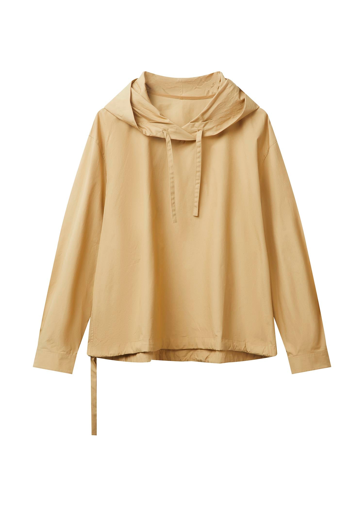 Made of organic cotton high-density poplin, the finished garment is crisp, smooth and has a sense of luxury. Adding a hat and a drawstring design to the shirt has the effect of reducing age at once.