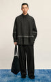 This oversized shirt features a needle-punched fabric splice at the hem and cuffs, where contrasting materials blend softly like ink washes in Chinese painting, creating a layered, misty effect.