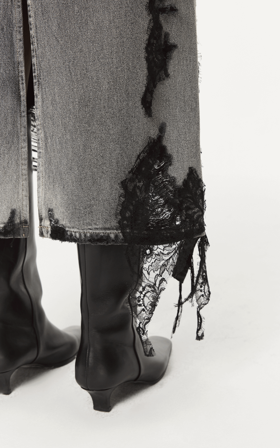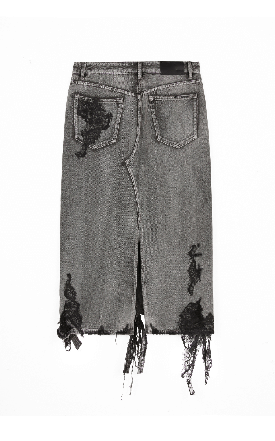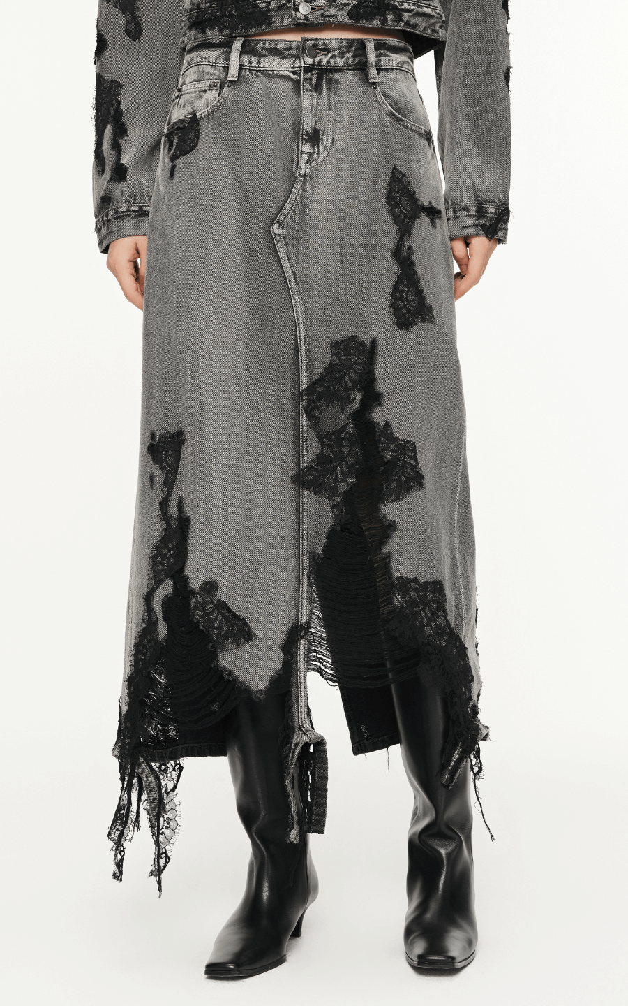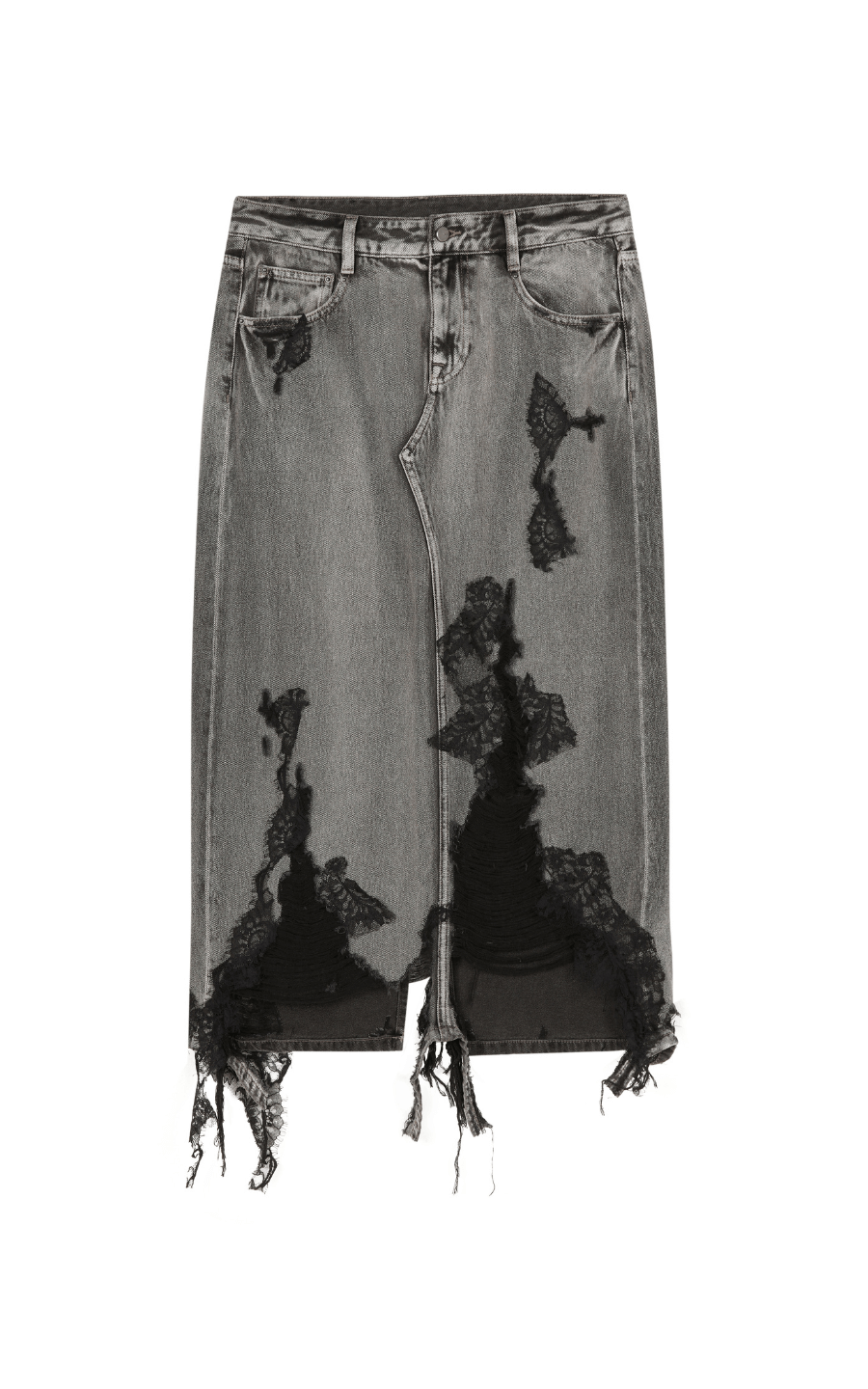 Skirt / JNBY Lace Patchwork Frayed Denim Long Skirt