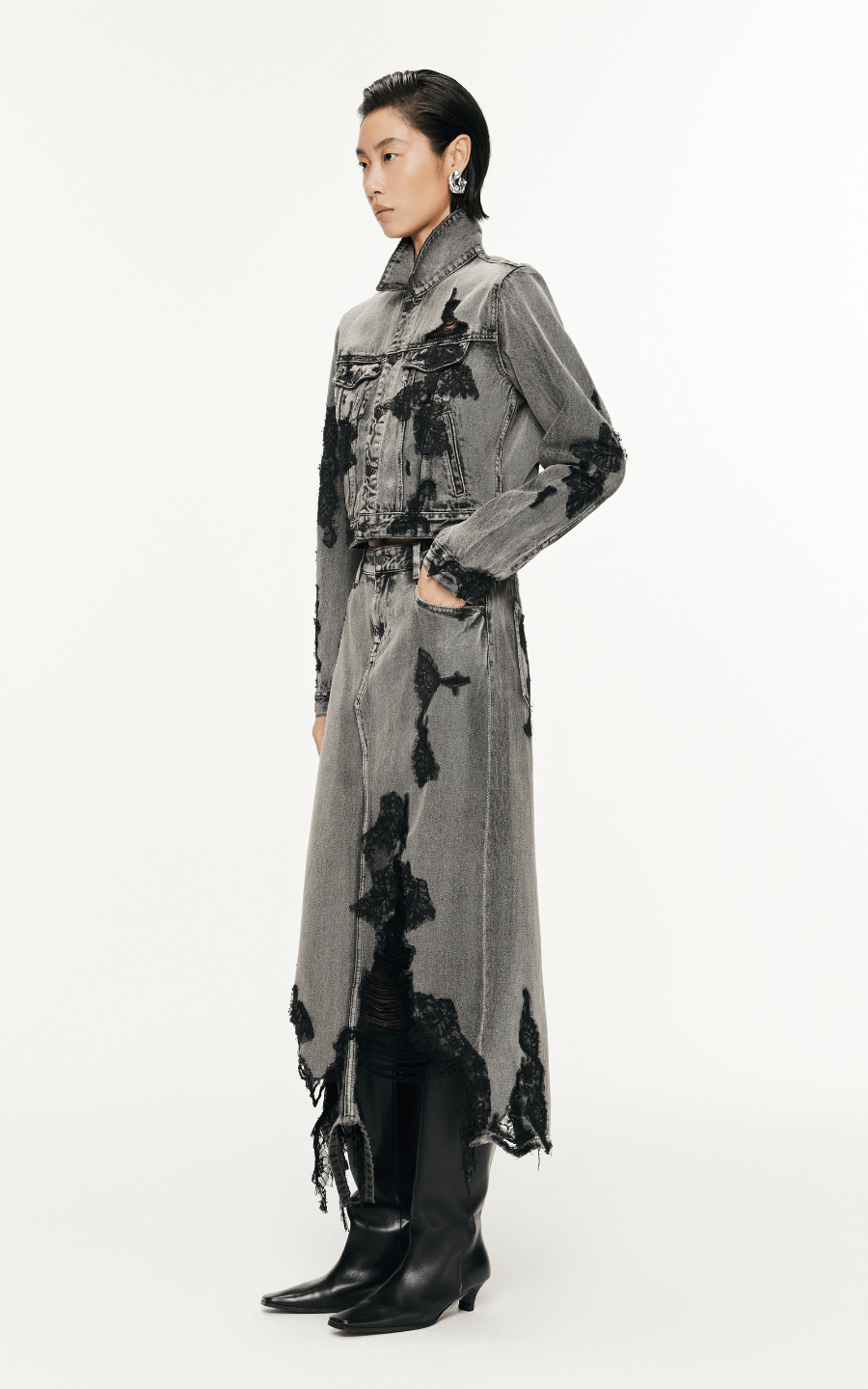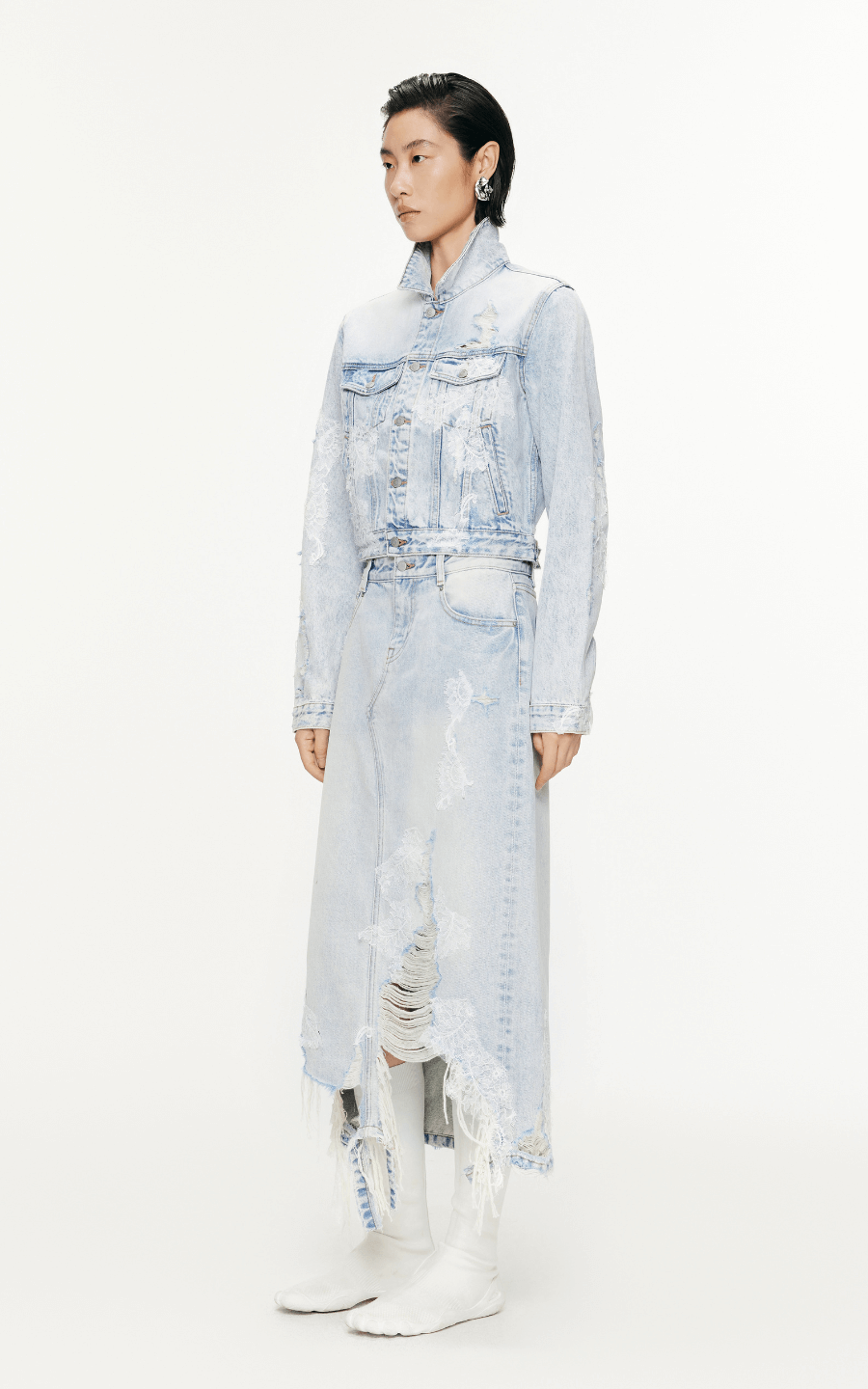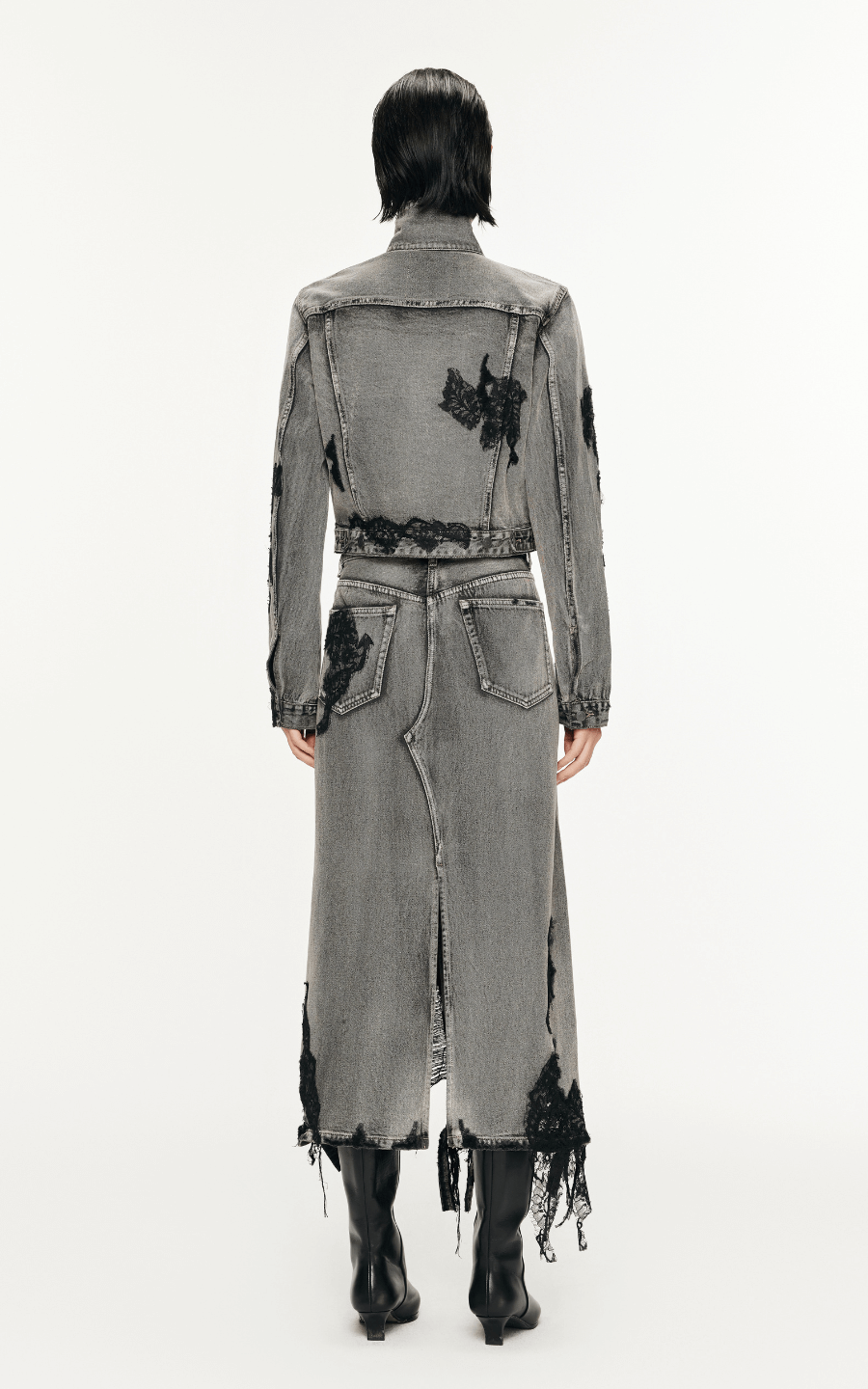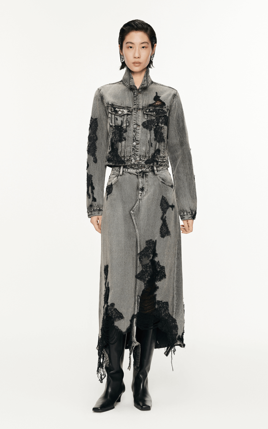 Skirt / JNBY Lace Patchwork Frayed Denim Long Skirt
