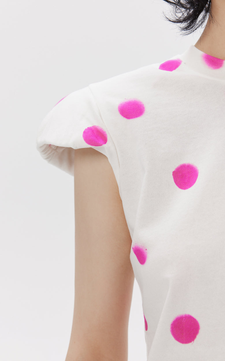 The shoulder pad design increases the shoulder line and makes it more modern. The polka dot print is casual and more youthful. The cotton material is naturally absorbent and feels soft against the skin.