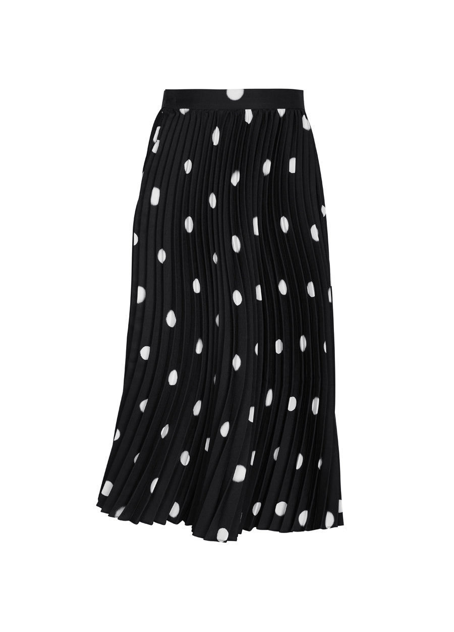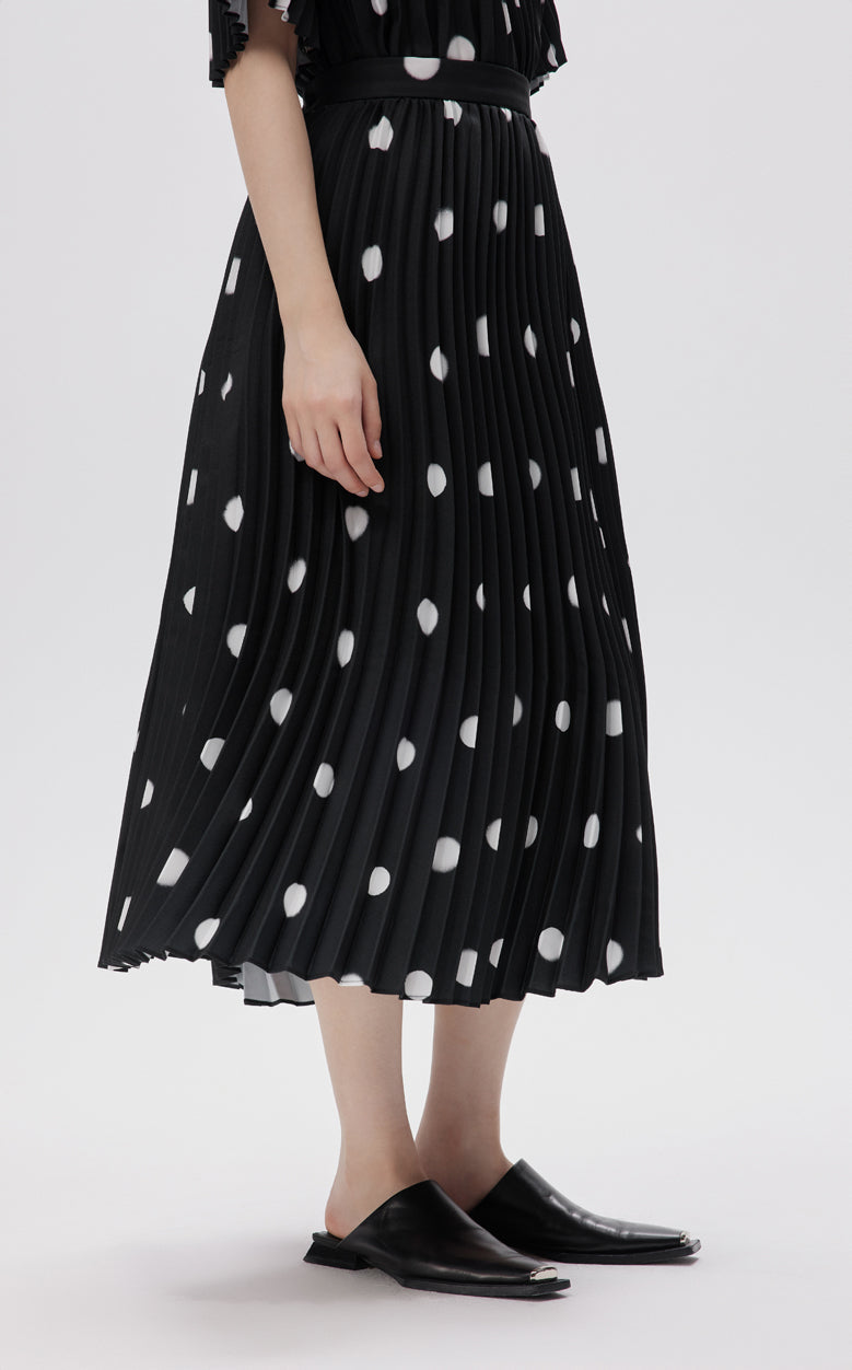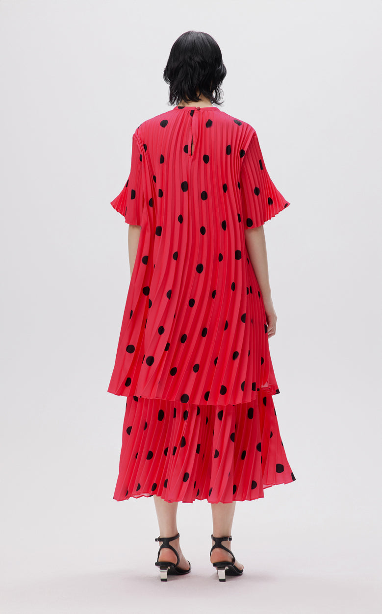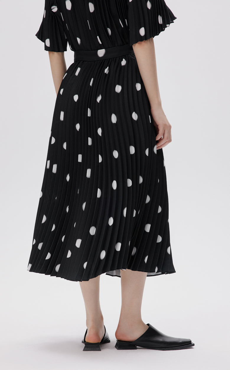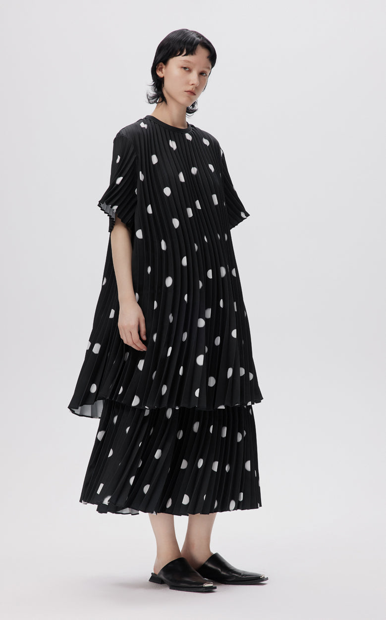 The retro polka-dot print collides with the stiff architectural pleats. The wavy folds break the rules and feel softer from the visual effect; the whole body is retro and modern with the same print.