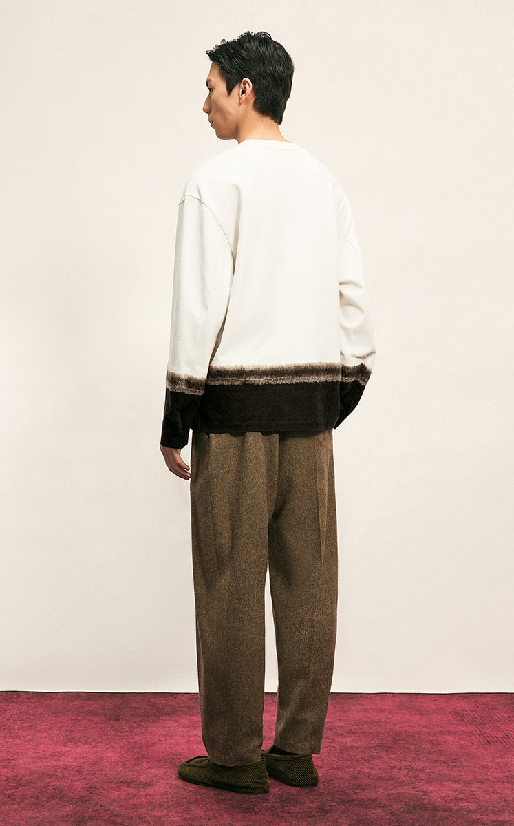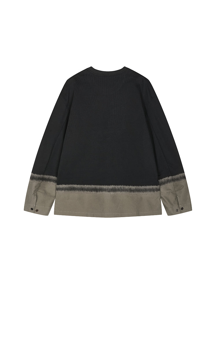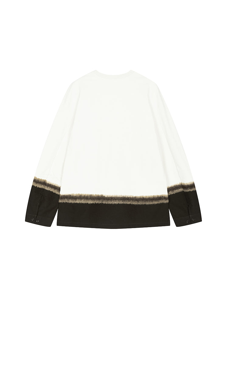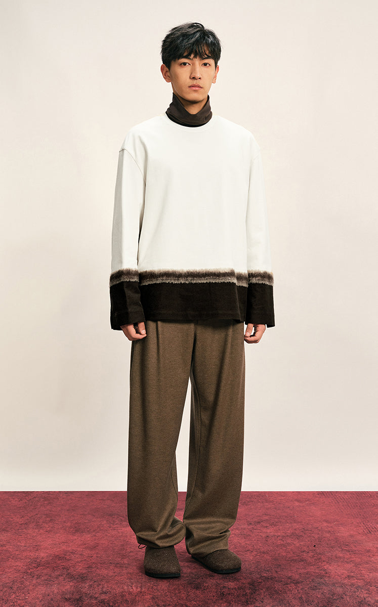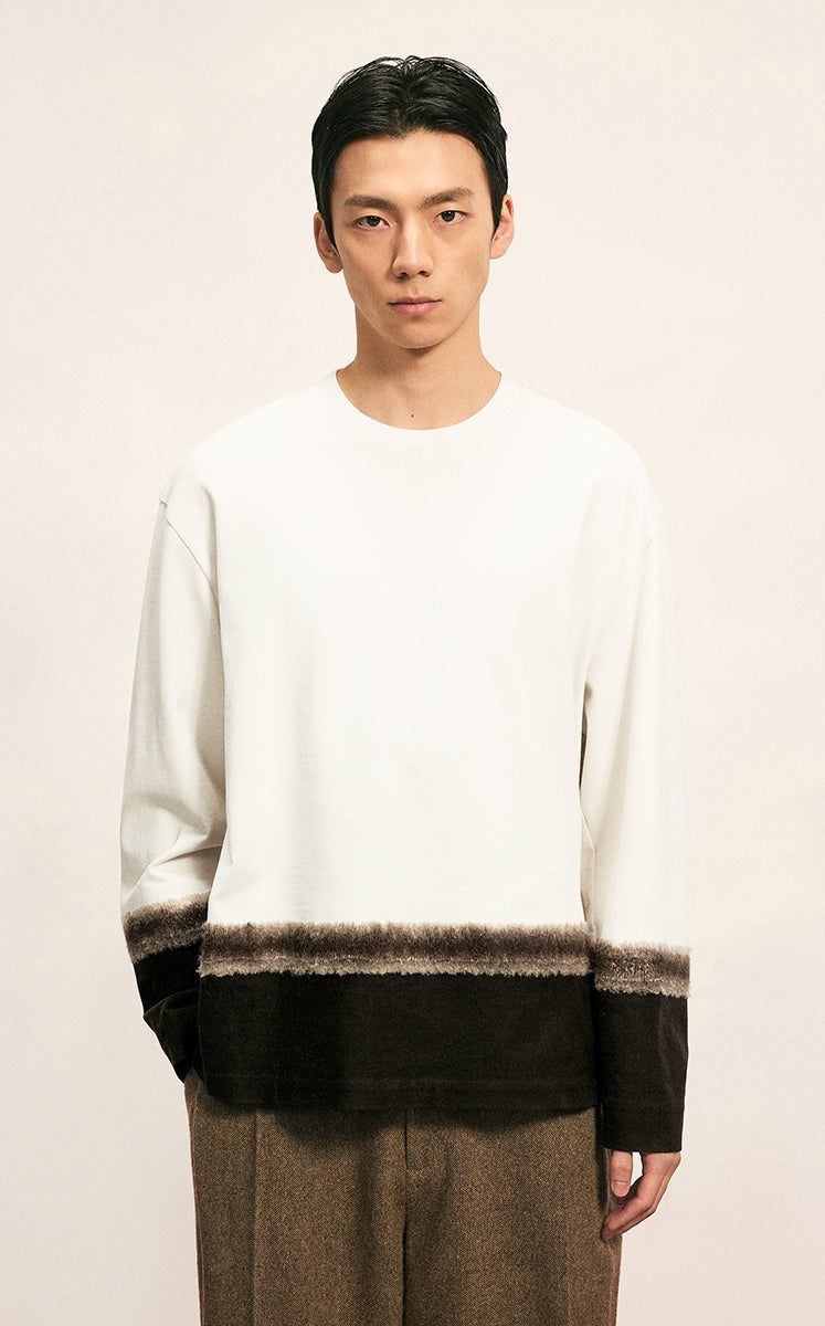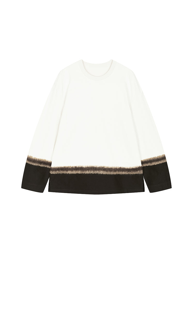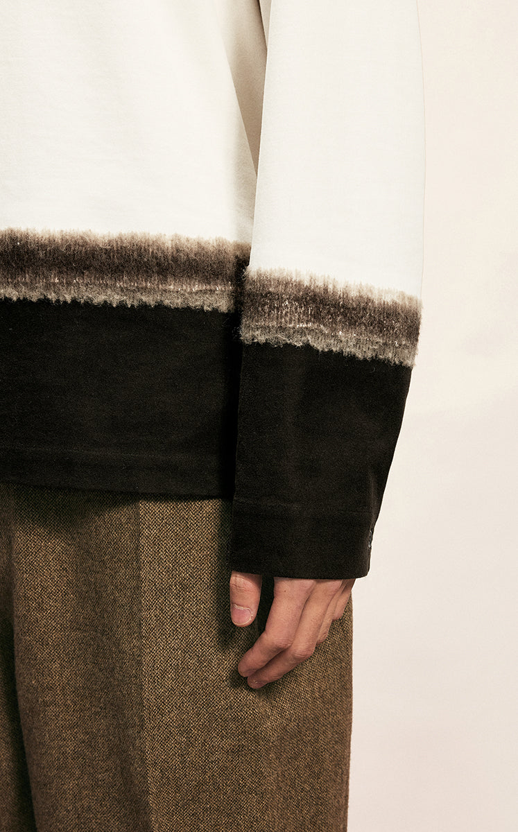 Distinctive needle-punched stitching detail at hem and cuffs, creating an artistic layered effect through texture variations.