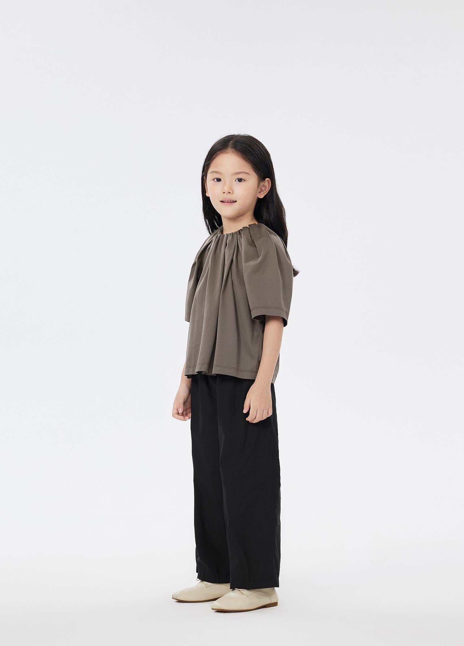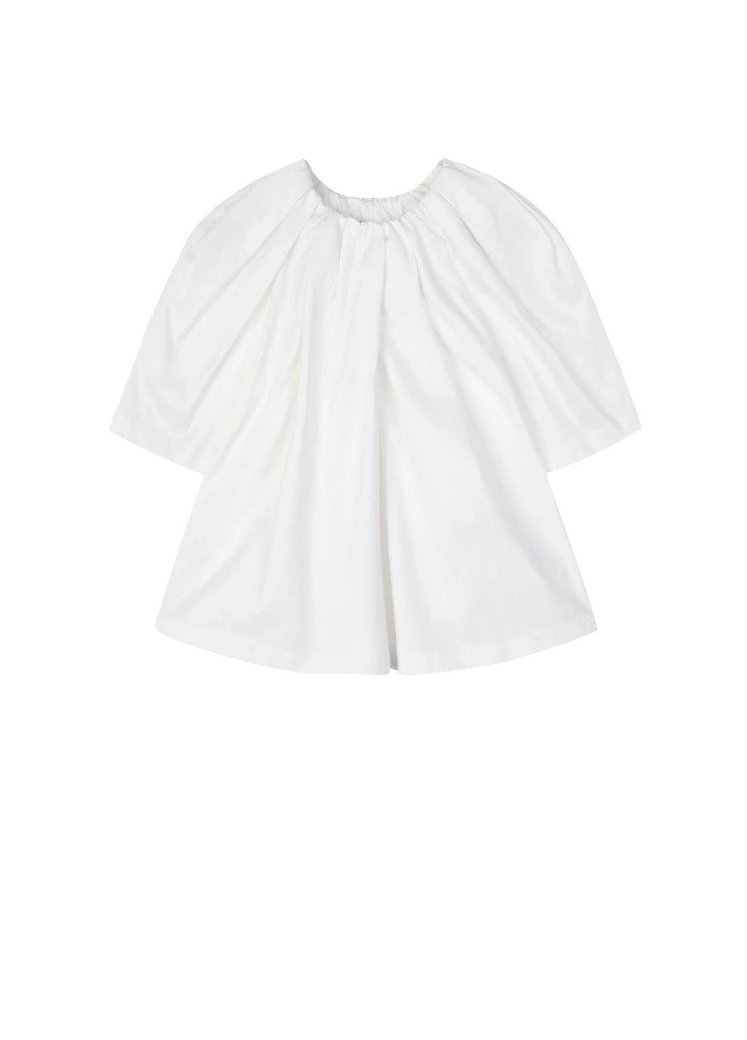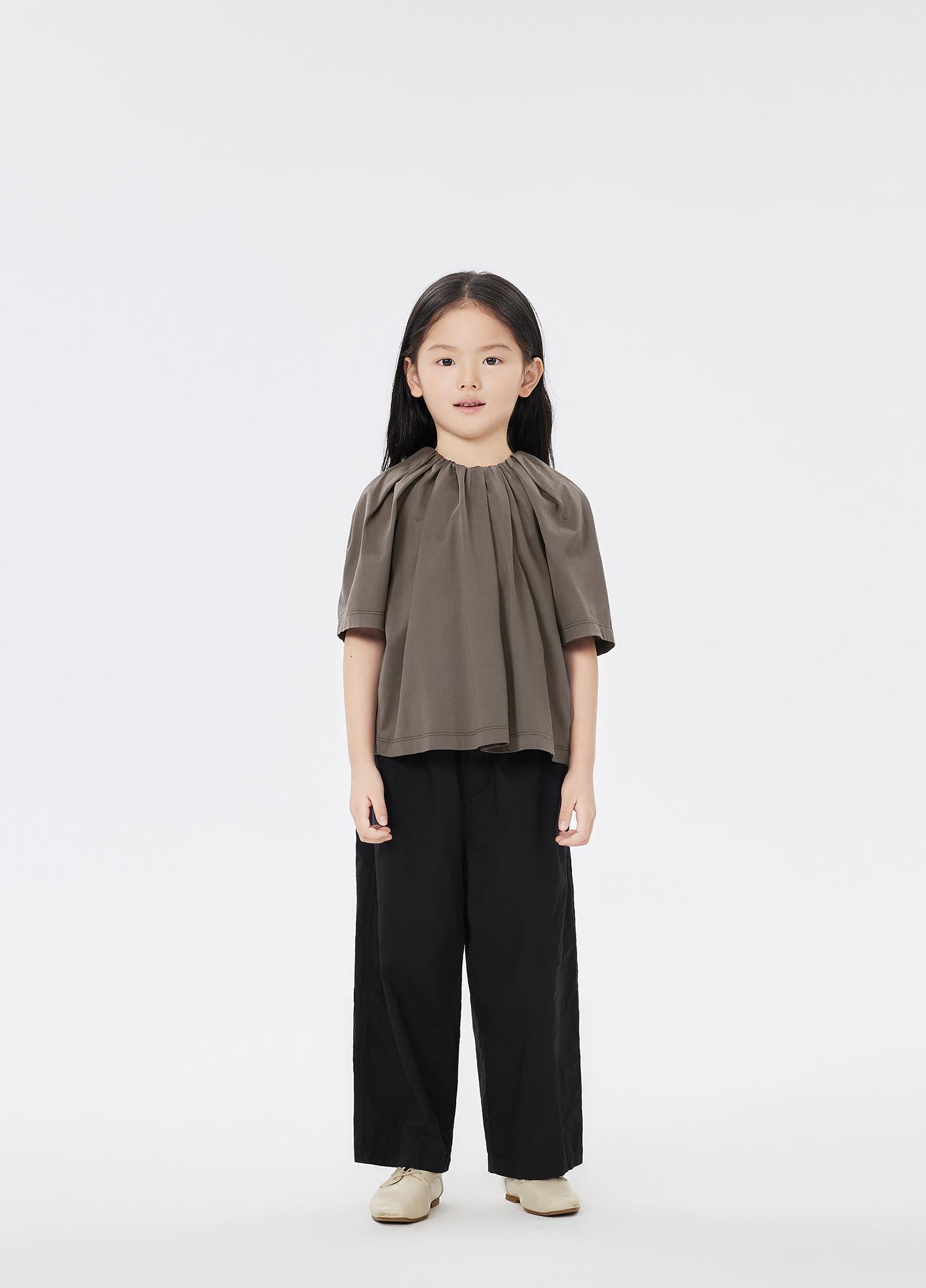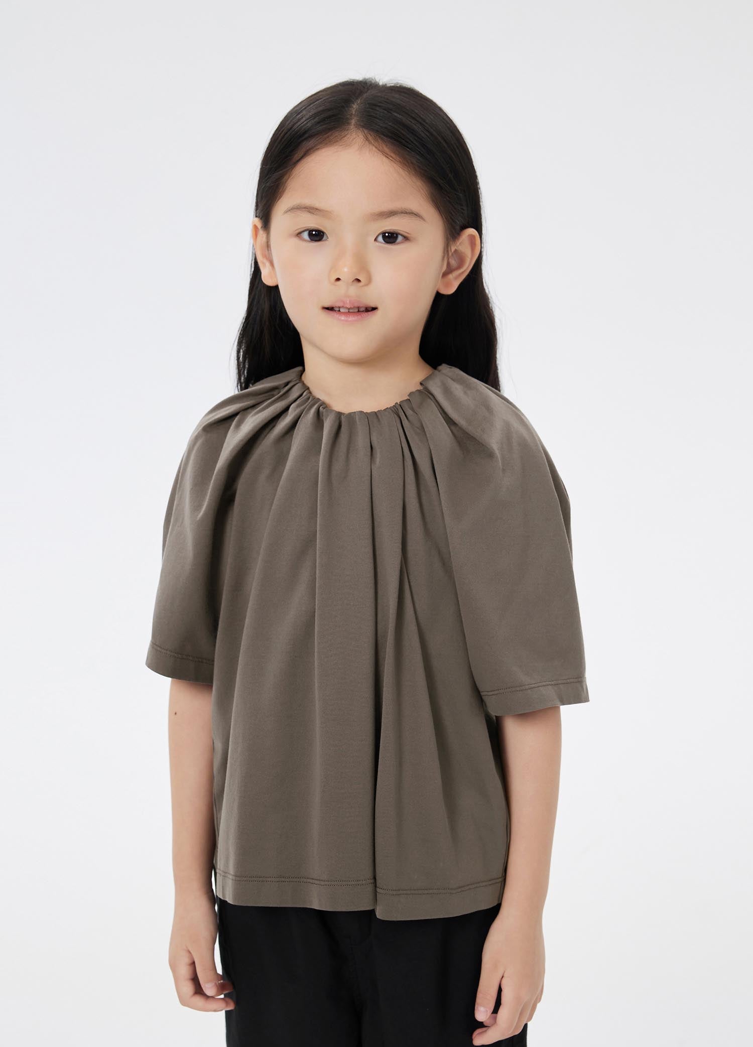 The fabric is mercerized jersey, which is very popular with mothers. It has a silky luster, and it feels delicate and smooth. It is very high-grade, and it is very comfortable for children to wear. This kind of shirred neckline and big sleeves have a sense of court, and children feel more princess-like when they wear them.