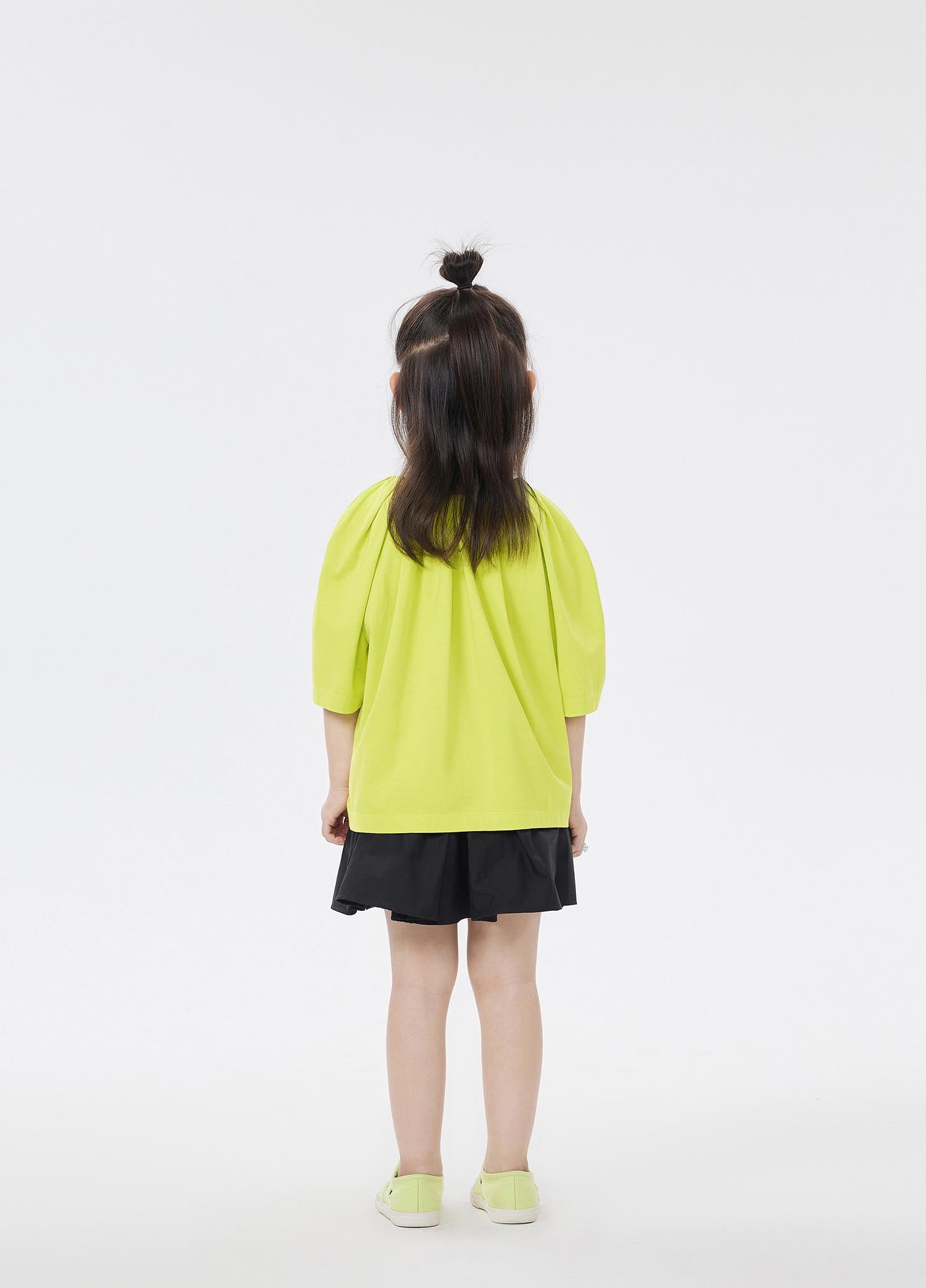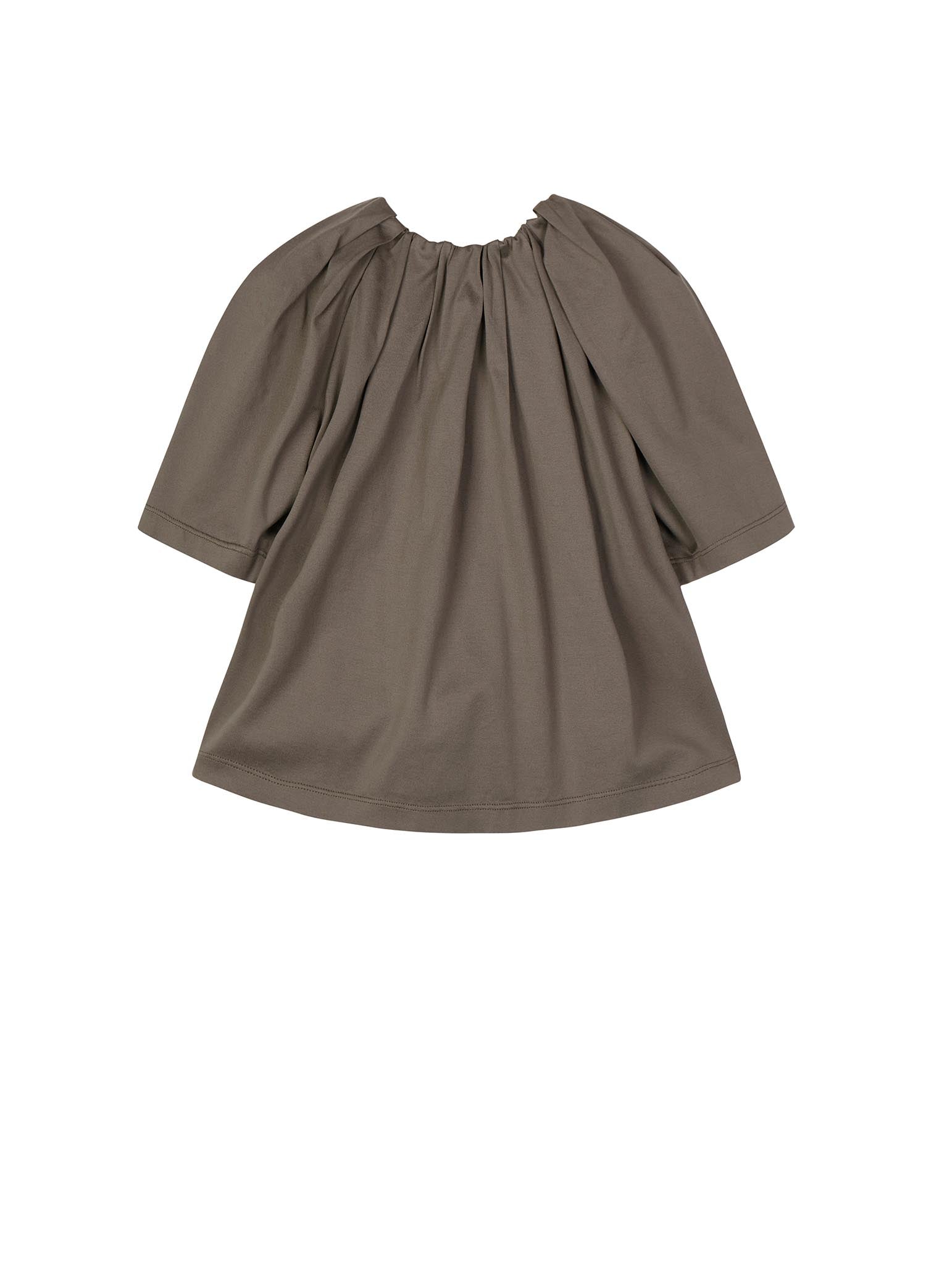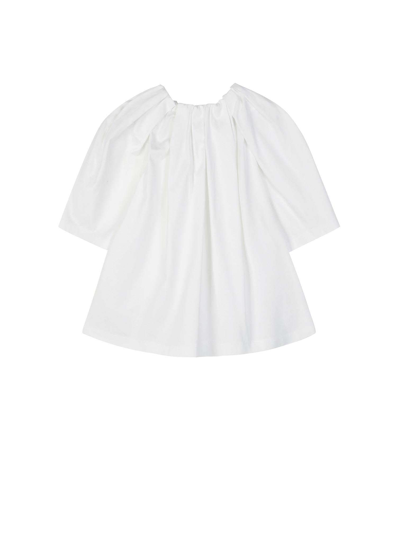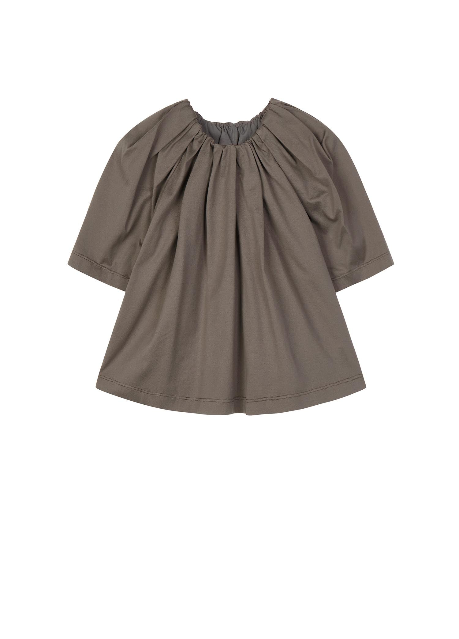 The fabric is mercerized jersey, which is very popular with mothers. It has a silky luster, and it feels delicate and smooth. It is very high-grade, and it is very comfortable for children to wear. This kind of shirred neckline and big sleeves have a sense of court, and children feel more princess-like when they wear them.