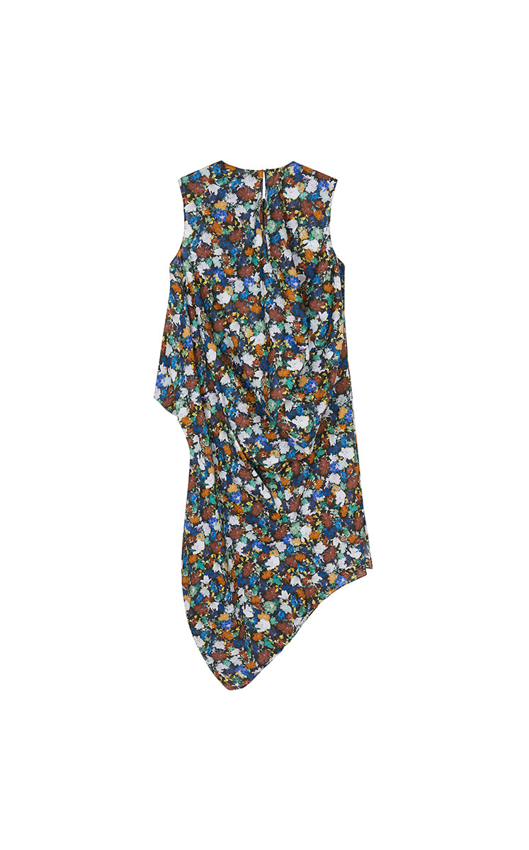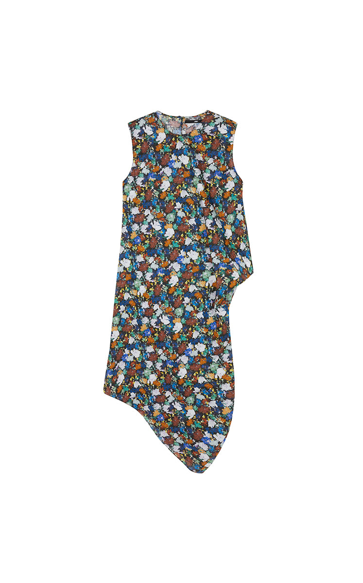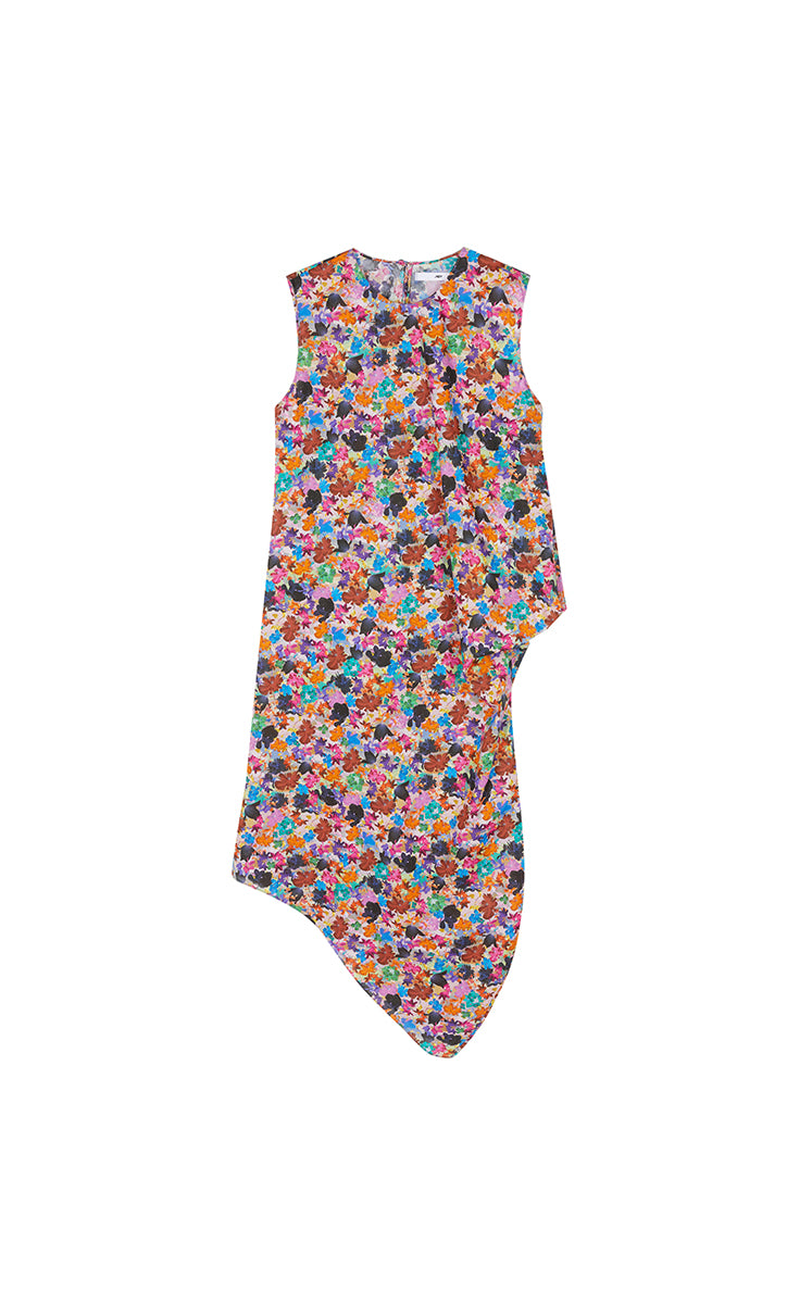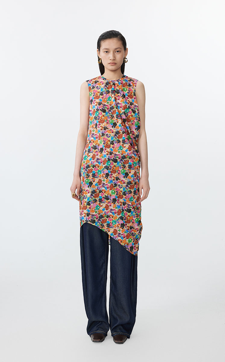 • Crafted from archival Liberty cotton fabric, this sleeveless dress fuses street-style edge with futuristic floral motifs. The deconstructed hem adds a bold, modern touch—perfect for women who express individuality through style