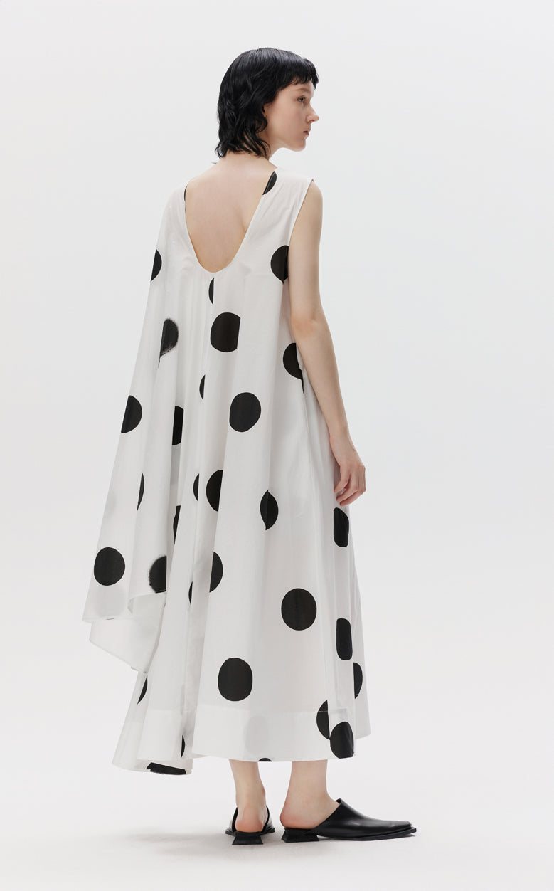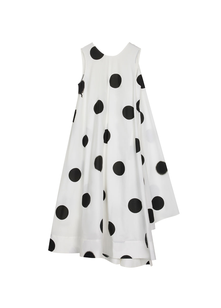 The V-neck shape makes the neck more slender and feminine, and the enlarged polka-dot print shows youthful vitality; the wavy skirt shows feminine elegance, and the irregular side piece design has a stronger sense of shape and is more modern temperament.