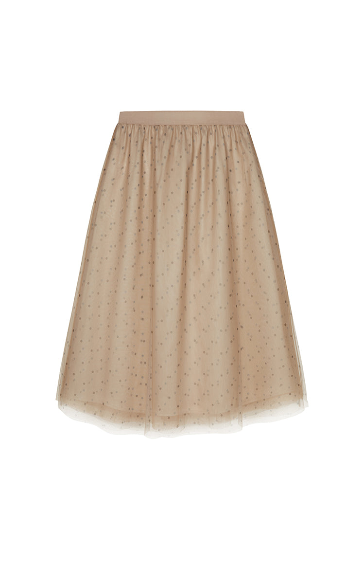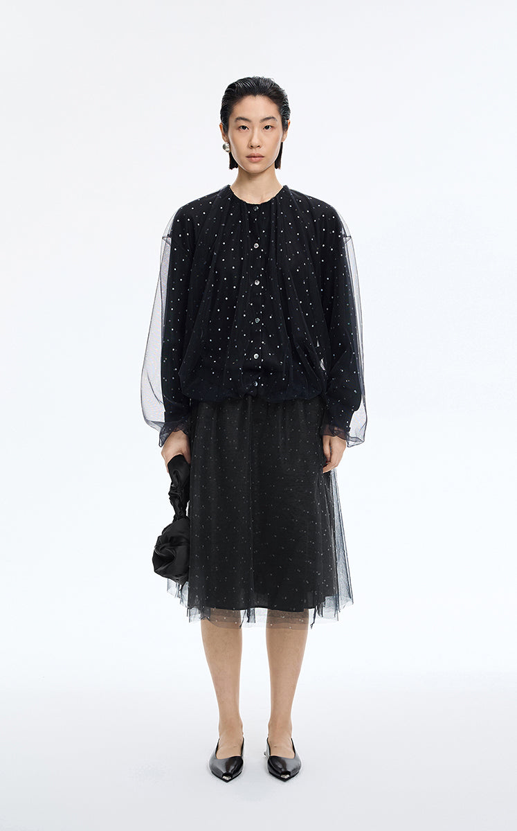 1.Polka dot pattern with layered mesh creates a light, airy, and textured look