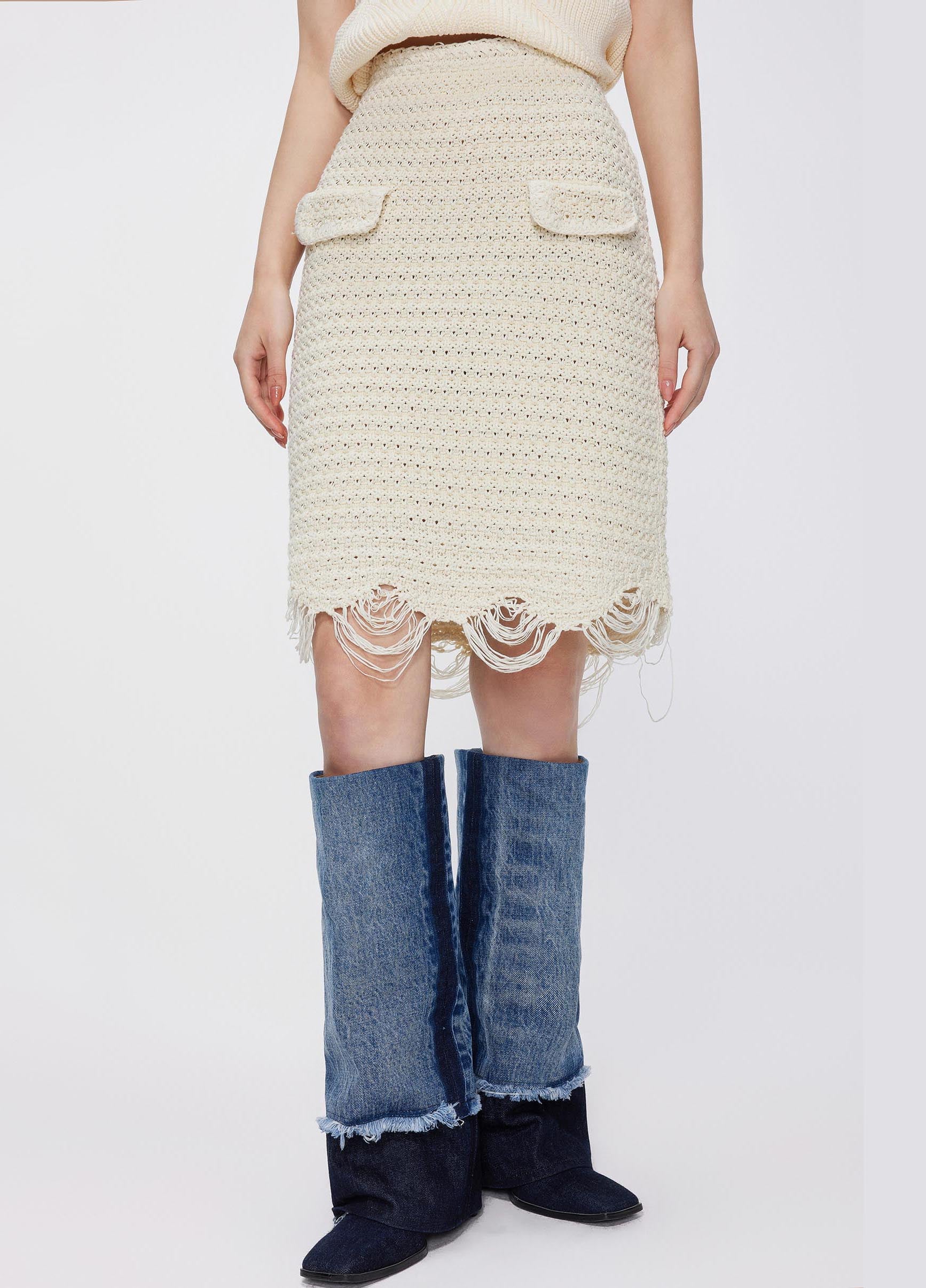 The skirt with woven elements is inspired by the weaving technique of Zambia, Africa. It is made into a rope-like weaving feeling, with petal-like raw edges on the edges, and the upper body is playful and feminine. It is recommended to wear it with a top of the same element as a suit. The design is strong and lively.